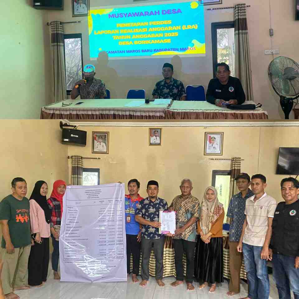 Maros,Borikamase,iNews07.Com – Pemerintah Desa Borikamase menggelar Musyawarah Desa (Musdes) Penetapan Laporan Realisasi Anggaran Tahun Anggaran 2025 yang berlangsung di Aula Kantor Desa Borikamase, Jumat (13/3/2026). Kegiatan ini difasilitasi oleh Badan Permusyawaratan Desa (BPD) sebagai bentuk pelaksanaan fungsi pengawasan serta upaya mewujudkan transparansi dalam penyelenggaraan pemerintahan desa.